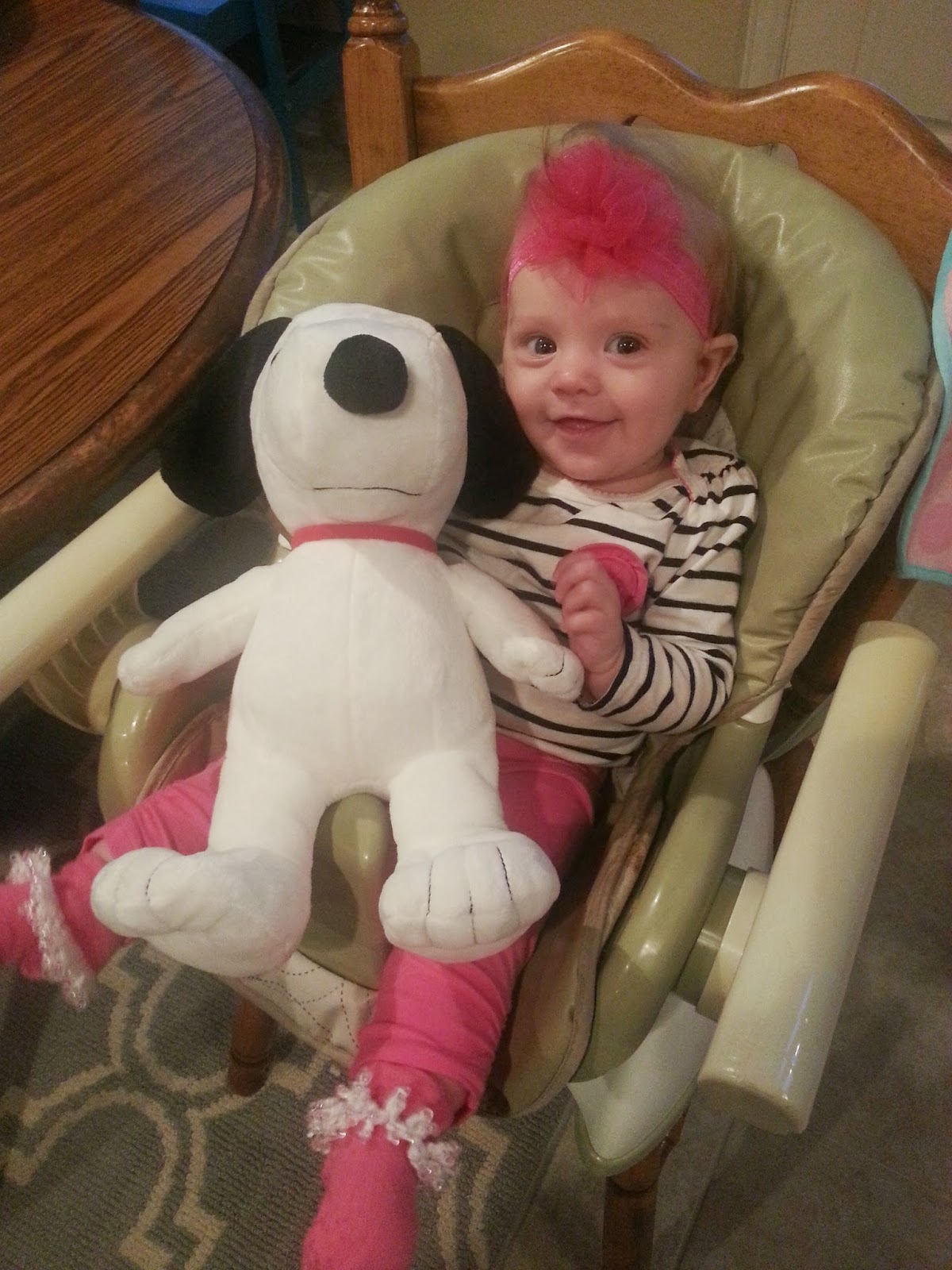 Sleep...oh boy. We were having a hard go with sleeping for awhile...I guess I just forgot about the transition from the newborn-easy-to-sleep phase to the we-have-to-teach-her-how phase. She was a great sleeper at first for a couple of months but then it turned ugly and we ended up taking turns holding her most of the night...mostly because we were lazy and had a really comfy recliner this time. Then we held off "sleep training" because we were going to be traveling for Christmas. The new year brought some hard nights for all of us but I am happy to say that she is doing much better now and we are all getting more rest now...even if it isn't always in our bed :) We aren't home free yet, but there has been lots of improvement here.